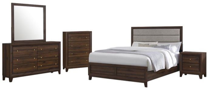 Create a chic, inviting retreat from the world with this modern wooden bedroom set. In a rich walnut wood finish, it imparts sophistication with a padded, upholstered headboard on the bed and drawers that are dotted with gold finish round knobs. The bed is complete with plush foam cushioning and taupe fabric, and features a tall headboard paired with a low footboard for an open look in your bedroom. Storage pieces add an austere, refined look with mitered trim work and tapering legs that add angularity. The set is crafted with durable engineered wood and features laminate surface that resist dents and scratches from everyday use to maintain a fresh, beautiful look.Read More
